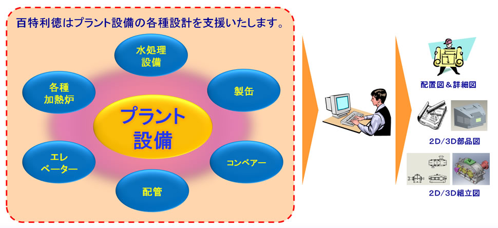 主に各種プラント機(jī)械設(shè)備の設(shè)計(jì)業(yè)務(wù)を受託しております。各種CADを駆使し、自動車部品の熱処理設(shè)備、エレベーター、水処理設(shè)備等の設(shè)計(jì)?作図業(yè)務(wù)を行っております。