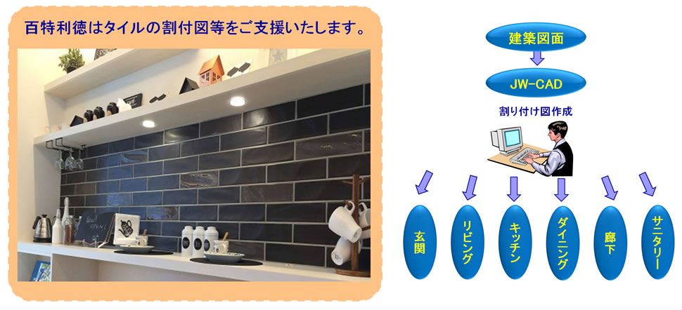 タイル設(shè)計等の作業(yè)を受託しております。JW-CAD等ソフトを駆使して、新築一戸建ての玄関、キッチン等の場所のタイル割付図を作成いたします。
