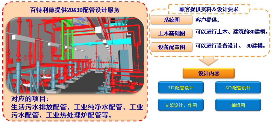 根據(jù)客戶提供的相關(guān)資料、 我們利用PLANT 3D 、 AUTOCAD 、 REVIT等多種軟件進(jìn)行工業(yè)配管設(shè)計(jì) 及制圖服務(wù)。